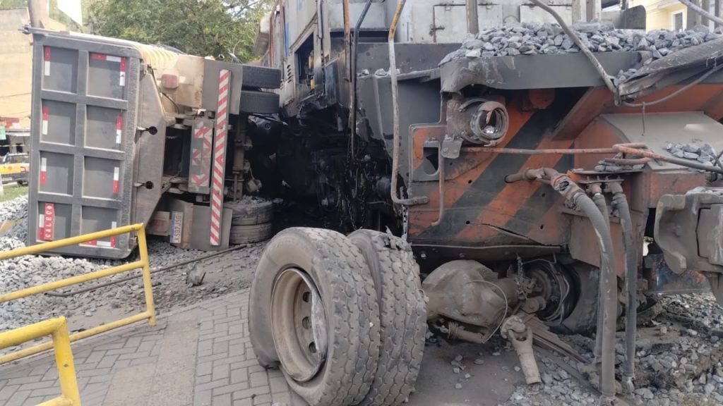 Nas imagens enviadas à produção da TV Rio Sul, é possível ver que o veículo, carregado com brita, estava tombado, com a carga espalhada pelo local e um dos eixos de roda arrancado. A lateral do trem também foi danificada com o impacto da colisão.